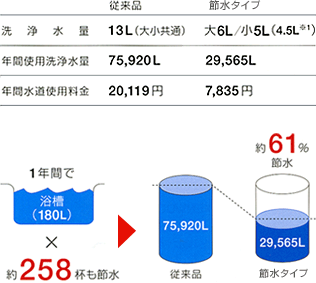 | 節水タイプのトイレでは1回の洗浄に必要な水が従来の約13リットルに比べ半分以下の約6リットルになりました。 | ![]() |
